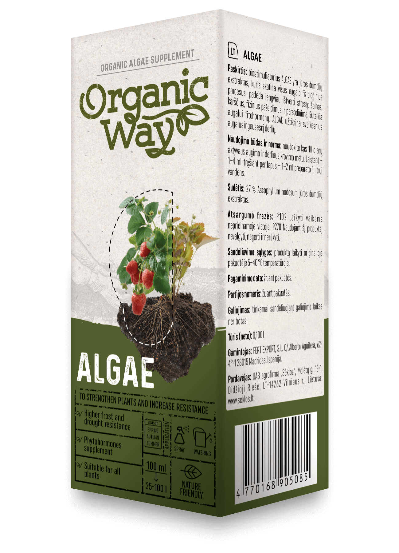 Designation: The biostimulant ALGAE features an algae extract that stimulates all physiological processes in plants, helps to increase tolerance to stress such as frost, heat, physical damages and replanting. Supplies plants with phytohormones. ALGAE ensures healthy plants and better yield.