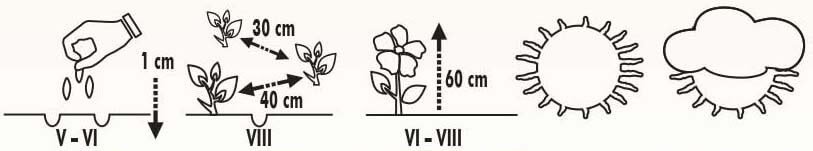 Perennial, grown as biennial, 60 cm height flowers. This variety is valued for its bright flowers and dark leaves for which the plant is standing out from others in flower beds. Flowers are 10 cm in diameter, bloom in abundance for extended periods. Seeds germinate within 8-10 days. Not demanding to light, resistant to frost, do not require covering in winter. Grow well in fertile, humus-rich soil. For planters, bouquets, survive long in the water when cut.
