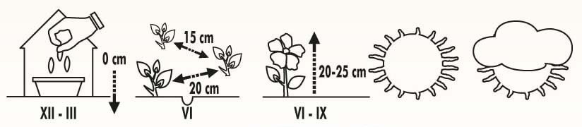 Annual, 20-25 cm height flowers. Bloom profusely until frost. Grow well in dry soil, love sunny places. Seeds germinate within 18-22 days at the temperature of + 22-24 °C. Grown in planters, pots. Seeds are coated with a well adhering mix of organic and mineral fertilizers. When germinating, do not cover them with substrate, only lightly press into the soil surface. To make seeds germinate, the soil surface must be constantly moist.