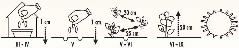Annual, 20 cm tall, extensively blooming flowers. Flowers are small. Grow and bloom in both sunny and shaded areas. Can be grown in flower gardens together with other perennial and annual flowers, are frequently grown in cemeteries, balconies. Contain volatile oil and a strong scent and therefore is called a sanitation herb to adjacent plants, grown after bulb flowers or between them.