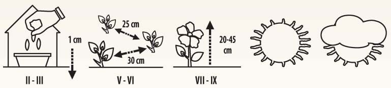 Annual, 25-45 cm height plants. Grown in balconies, terraces, gardens. Flowers are 15 cm in diameter, bright, with pleasant vanilla scent. Grow well and bloom in sunny, protected from wind place. Seeds are sown to boxes in greenhouses, not covered with soil; germination takes a long time, and is uneven. Seedlings are planted outdoors after frost, watered with lukewarm water. Perfect in combination with marigold, senecio cineraria.