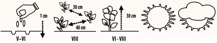 Perennial, grown as biennial, 30 cm height flowers. Flowers are 10 cm in diameter, bloom in abundance for extended periods. Seeds germinate within 8-10 days. Growing flowers are not demanding to light, resistant to frost, do not require covering in winter. Grow well in fertile, hummus rich, water-permeable soil. For planters, bouquets, survive long in water when cut. Grown in clusters, flower gardens, flowerbeds, in borders, pots.