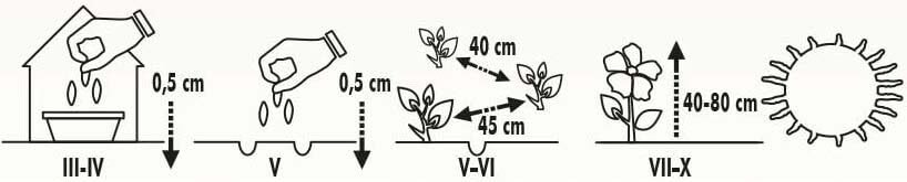 Annual 40-80 cm flowers. Flowers are 5-7 cm in diameter, multi-colored, with a pleasant scent. Stem is branching from the middle. Grow well and bloom in light semi-shade, in the place of the flower bed protected from wind. Very good in combinations with annual flowers, grown in clusters. Planted in flowerbeds after the danger of frost. Good for bouquets. Tobacco can be planted in the same place after 2 years.
