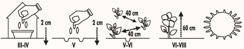 Annual, easy-grown, long-blooming flowers producing abundant blooms. Shrubby plant with large blooms. Looks best if planted in groups. Planted as background plants in gardens by selecting warm, sunny locations protected against winds. Blooms cut for small bouquets. These flowers are especially liked in farmsteads.