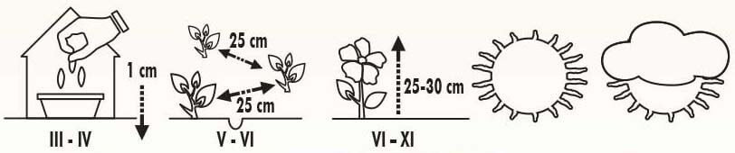 Biennial 25-30 cm flowers, one of the most popular background plants. Has ornamental gray leaf very good in combinations with bright flowers. Suitable for planters, grown in pots, balcony planters, filling spaces in flower beds, in rock gardens. Not demanding to soil. Seeds are sown early, seedlings are pricked out one by one in pots. Planted outdoors from May. Remain ornamental even after the first frost.