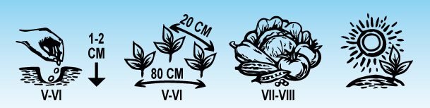 Early hybrid variety. Grown outdoors. Harvested every day, when the fruits are 5–8 cm long. Used fresh, suitable for pickling, good for canning. Gherkins should not be planted in the same place until 2–3 years have passed.