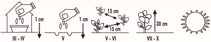 Annual 30 cm flowers. Flowers are 5-6 cm in diameter. Grow and bloom both in a sunny and shaded area. Can be grown in flower gardens together with other perennial and annual flowers, are frequently grown in cemeteries, balconies. Marigolds are also suitable for food seasoning, salad decoration. Marigolds are grown after bulb plants or between them, to eliminate pests and disease from the soil.