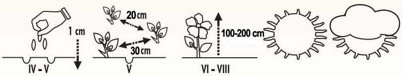 Annual, climbing, 1–2 m height flowers. Flowers have bright colours, very decorative, with a pleasant scent. Grow well in sunny, protected from the wind places, humus-rich, tilled and loosened soils to 30 cm depth. Before sowing the seeds should be germinated and sown in moist soil. Sown in clumps, 3–5 seeds each, at supports. You can make a blooming and fragrant wall for the whole summer, picked for small bouquets.